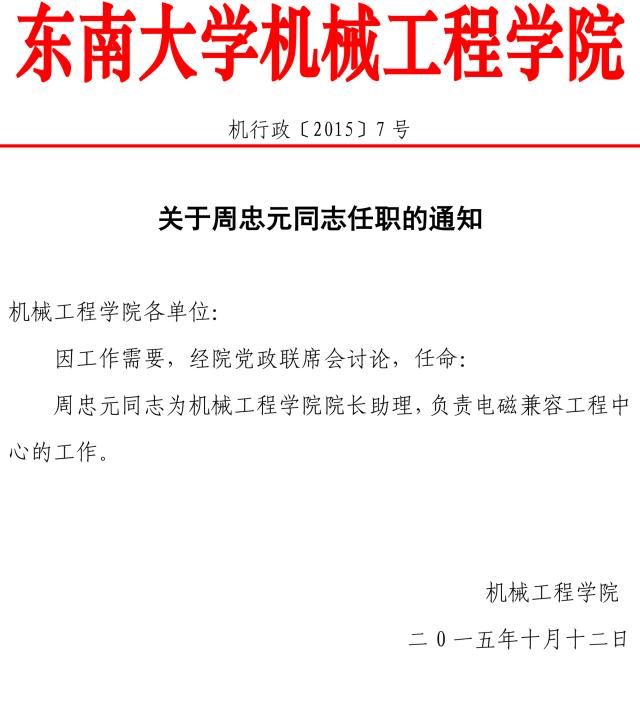 关于周忠元同志任职的通知