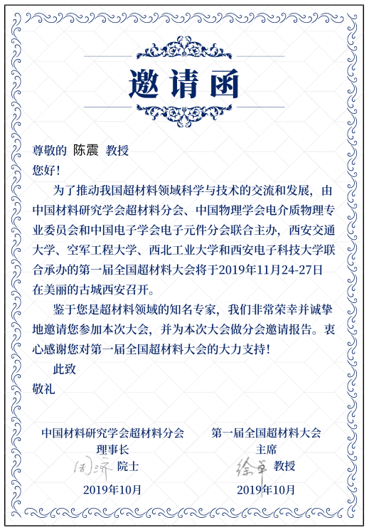 第一届全国超材料大会于2019年11月24 ~ 27日在美丽古都西安召开,开云手机官方站在线入口的陈震教授受邀参加大会并作特邀报告。