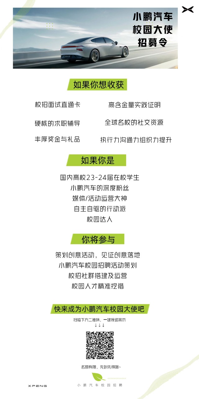 在小鹏,你将深度了解新能源汽车行业,策划并落地校园活动、运营学生社群,在实践中提升求职技能,还能收获校园大使专属内推机会&求职辅导&丰厚报酬奖励!!期待2023&2024届的你,加入我们,成为下一个校园推广达人!有意向的同学可以直接扫码投递或简历直达邮箱(zhanghy@xiaopeng.com)