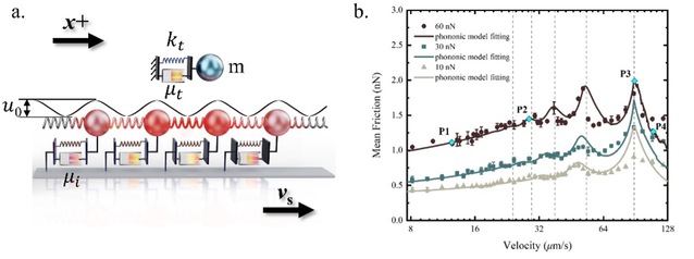 图 (a) 原子力显微镜测试摩擦力的原理图,研究团队在国际上首次提出摩擦阻力与滑块振动速度成正比的声子摩擦模型;(b) 研究团队提出的声子摩擦模型准确地预测了原子力显微镜测试的摩擦力结果。