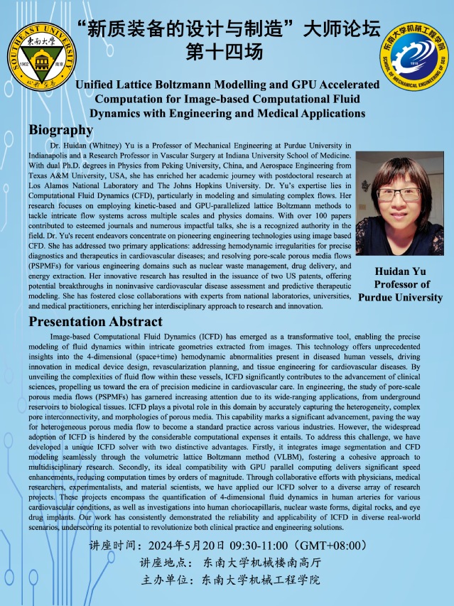 “新质装备的设计与制造”大师论坛 第十四场:Prof. Huidan Yu——Unified Lattice Boltzmann Modelling and GPU Accelerated Computation for Image-based Computational Fluid Dynamics with Engineering and Medical Applications