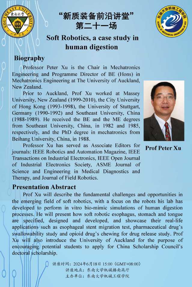 ProfXu will describe the fundamental challenges and opportunities in the emergingfield of soft robotics, with a focus on the robots his lab has developed toperform in vitro bio-mimic simulations of human digestion processes. He willpresent how soft robotic esophagus, stomach and tongue are specified, designedand developed, and showcase their real-life applications such as esophagealstent migration test, pharmaceutical drug’s swallowability study and opioiddrug’s chewing for drug release study. Prof Xu will also introduce theUniversity of Auckland for the purpose of encouraging potential students toapply for China Scholarship Council’s doctoral scholarship.