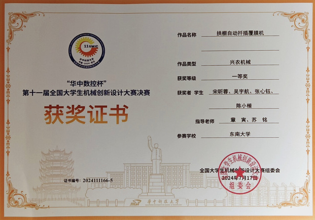 7月17日,“华中数控杯”第十一届全国大学生机械创新设计大赛决赛在华中科技大学落下帷幕。机械学子宋昕蓉、吴宇航、张心钰和陈小楷组成的参赛队伍,在章寅和苏铭老师的指导下,凭借《拱棚自动扦插覆膜机》作品喜获全国一等奖(最高奖)!王郑、豆文欢、杜煜成和王子阳同学在王玉娟和毕可东老师指导下完成的《蝴蝶东南飞》作品获得全国三等奖。