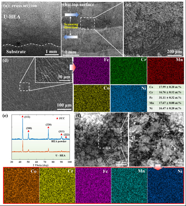 图2 CoCrFeMnNi高熵合金沉积层微观组织。(a) 沉积层的横截面形貌,(b-d) 沉积层顶部形貌及其EDS图谱,(e) CoCrFeMnNi粉末和沉积层的XRD图谱,(f)沉积层的TEM图像