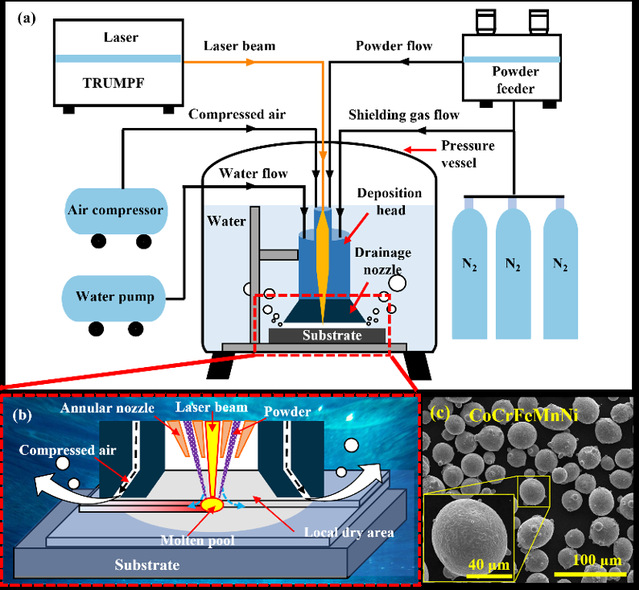 图1 材料及实验方法。(a, b) UDMD系统示意图及沉积过程示意图,(c) CoCrFeMnNi高熵合金粉末