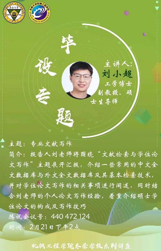 221日下午,毕业设计专题指导讲座第二场开讲,由机械工程学院副教授、硕士生导师刘小超老师带来内容为文献检索和学位论文习作的分享。刘老师首先详细地介绍了中英文全文数据库检索,包括数据库的定义、类型以及检索的逻辑等,很大程度上帮助同学们缩小了检索范围,提高检索的效率。此外,刘老师以自己的本科和硕士毕设论文为例,结合自己的亲身体会,按照论文框架结构,为同学们详细介绍了学士学位论文写作的规范和写作技巧。讲座的最后,刘老师期望同学们重视本科毕业设计,认真做好每一项工作,为以后的科学研究打下良好的基础。